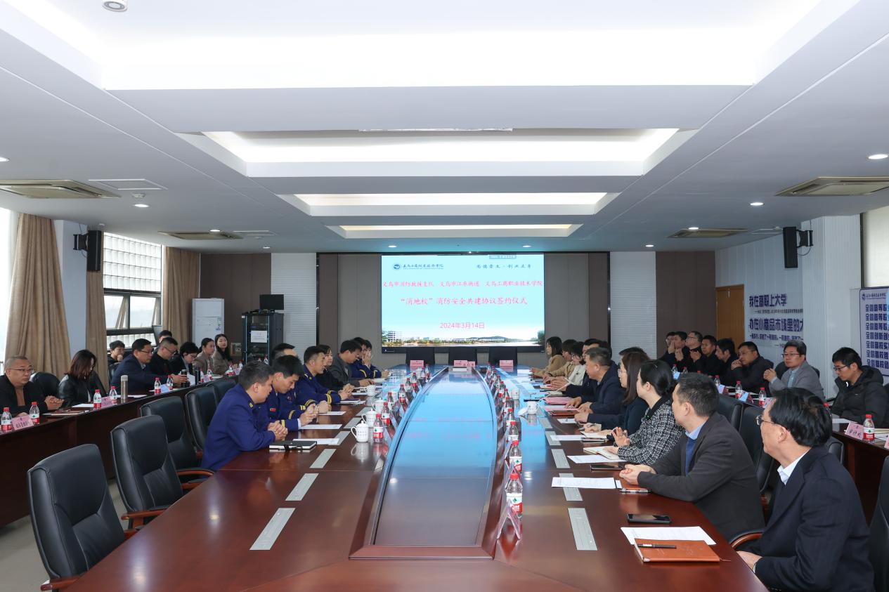 3月14日上午,学校召开2024年校园安全工作会议暨“消地校”消防安全共建协议签约仪式,深入学习贯彻习近平总书记关于校园安全稳定重要指示精神,分析研判新形势新任务,研究共建“消地校”合作新机制,为学校事业高质量高水平发展提供更加有力的安全保障。义乌市消防救援支队政治委员唐继文,江东街道党工委副书记、办事处主任傅凤丽,消防救援支队副政治委员斯日辉,江东街道党工委委员、办事处常务副主任陈健,义乌工商职业技术学院党委副书记叶斯源,党委委员、副院长樊曜出席会议,义乌市消防救援支队和江东街道相关部门负责人,学校各职能部门负责人和学院党政负责人参加会议。会议由樊曜主持。