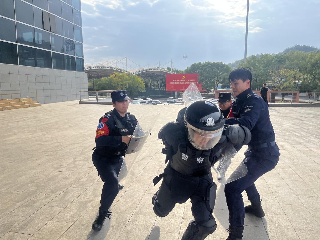 演练模拟地点在校园宗泽体育馆,楼仁斌为学校保安团队进行了专业且深入的培训,详细解读了恐怖袭击与暴力事件的各类形式、典型特征,同时就极具针对性的预防策略与应对技巧展开深入讲解,并着重强调了校园安全防范工作的重要性与紧迫性,为即将开展的演练夯实了理论根基与技能基础。可疑人员闯入校园后,安保人员上前进行拦截并询问其身份。对方拒绝配合,并掏出随身携带的刀具示威。保安迅速反应,使用防暴盾、防暴钢叉将“歹徒”制服,及时化解了危机。