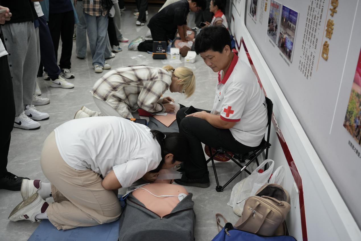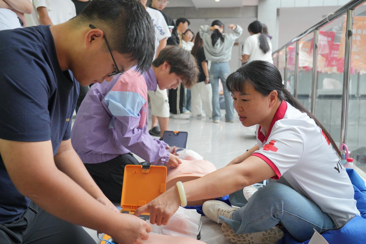 系统推进,全面培训。形成以“教-学-考-证”一体化的培训模式,包括心肺复苏(CPR)、AED使用、创伤救护(止血、包扎、固定)及海姆立克急救法等实用技能,分为理论教学、线上考核和实操演练三个环节。通过与红十字会的深入合作,优化课程设置、规范培训教学,每年急救技能培训覆盖全体新生,至今已有一万三千余名学生获得相关证书。