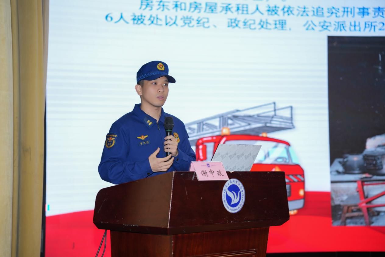 稠江消防救助站谢中政以典型火灾案例为警示,剖析校园消防通道堵塞、违规使用大功率电器设备等常见隐患及火场致命因素,现场讲解灭火器“提拔握压”、室内消火栓的规范使用方法,详细讲解火场报警要点、逃生自救技巧,强调不乘电梯、低姿前行等核心原则,切实提升师生火险应对能力。